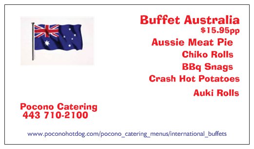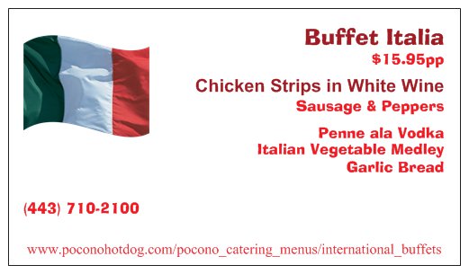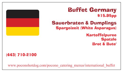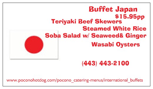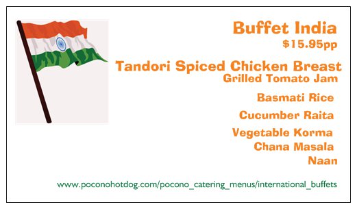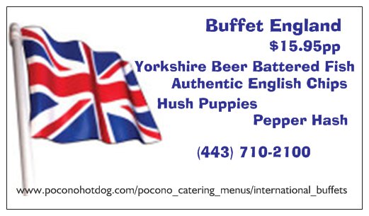 Introducing our Bold New International Buffet Menu inspired by Chef J. Gagion. Our Soon to be World Wide Famous Buffets are now available in The Beautiful Pocono Region of Pennsylvania. There is something for everyone and even more for those adventurous Gastroms......We can negotiate a Peace Treaty between Two countries for an Additional $8.00pp